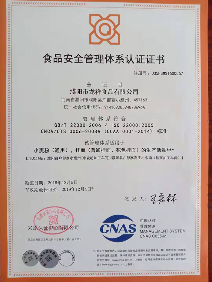 食品安全管理體系認(rèn)證證書(shū)